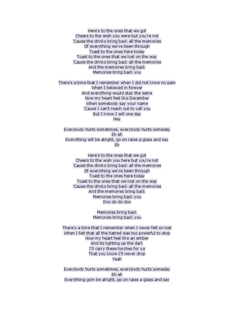 Cheers to the wish you were here but youre not. Am Em when somebody say your name F C cause I cant reach out to call you F G but I know I will one dayyeah C G everybody hurts sometimes Am Em everybody hurts someday ay ay F. Heres to the ones that we got Cheers to the wish you were here but youre not Cause the drinks bring back all the memories Of everything weve been.